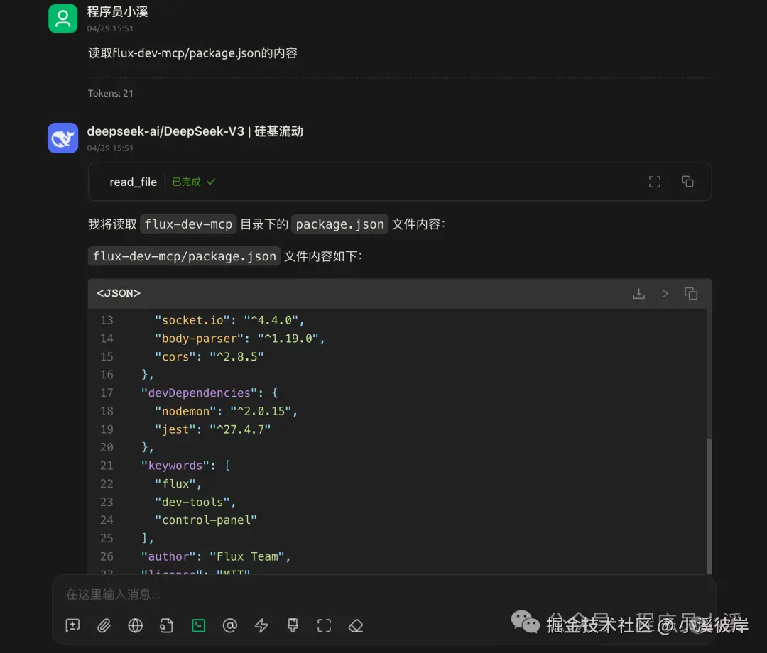 如果想当前文件内容,可以直接告诉AI“读取flux-dev-mcp/package.json的内容”