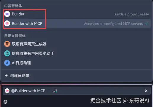 这里选择内置的Builder或者Builder with MCP智能体进行开发: