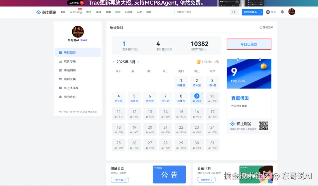 前几天又恢复在掘金平台发布文章了,一方面是想参加掘金推广Trae的一些活动,另一方面,作为程序员,掘金也是一个不错的(精准)扩大自己影响力的技术内容分享和交流平台。
