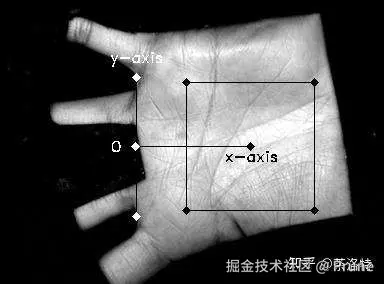 根据论文需要获取手指指缝的两个谷点,并构建直角坐标系,截取ROI 该部分方法参考了 Opencv-Python提取掌纹图片ROI 基于图像相位及方向特征的掌纹识别的c++实现(二)