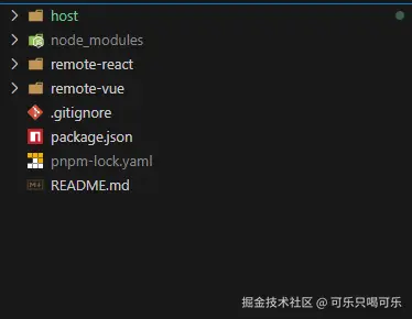 首先初始化项目pnpm init,配置所有项目的依赖安装等统一配置,然后通过 pnpm create vite创建React版本的Host应用以及两个React和Vue版本的Remote应用。