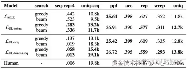 注:上图为论文中的结果,其中seq-rep-4代表4-gram重复率;uniq-seq代表总共出现的不同词的个数;ppl代表句子困惑度;acc代表句子准确性;rep代表前词重复率;wrep代表加权前词重复率。从这些指标中可以明显观察到,unlikelihood training能降低整体生成句子的重复度。