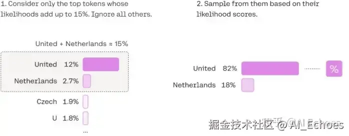 Nucleus sampler俗称TopP采样,一种用于解决TopK采样问题的新方法,该采样方式不限制K的数目,而是通Softmax后排序token的概率,当概率大于P时停止,相当于当模型很确定下一个token时,可采样的K也会很少,减少异常错误发生的概率。以下图为例,TopP采样会不断选择logit中最大概率的 token,放入一个list中,直到list中计算的总概率大于设置的TopP值,后对list中的token概率进行重新计算,最终根据计算出来的概率值对list中的token进行采样。