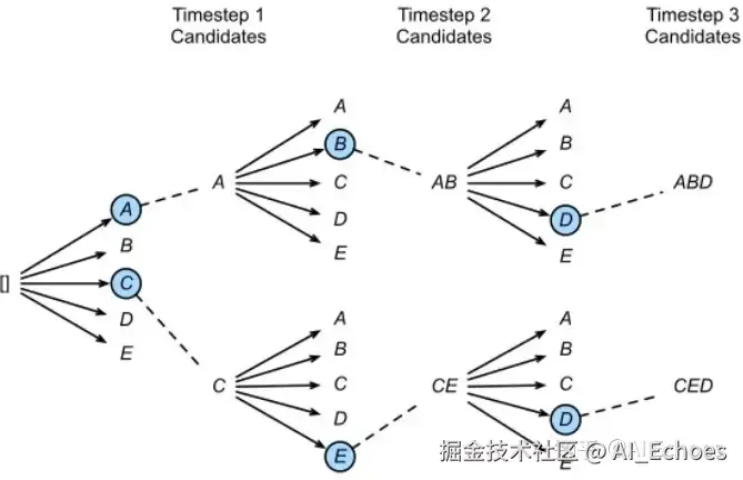 下图是一个实际的例子,每个时间步有ABCDE共5种可能的输出,图中的num_beams=2,也就是说每个时间步都会保留到当前步为止条件概率最优的2个序列。