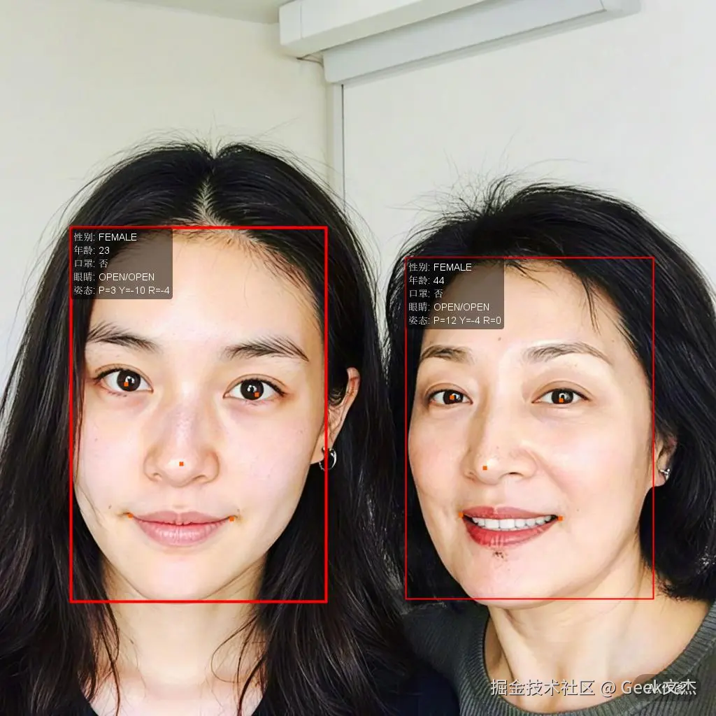 结果会返回一个 DetectionResponse,里面有每张脸的坐标、属性、关键点信息,像这样: