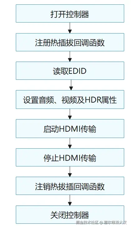 本例程以操作开发板上的HDMI设备为例,详细展示HDMI接口的完整使用流程。