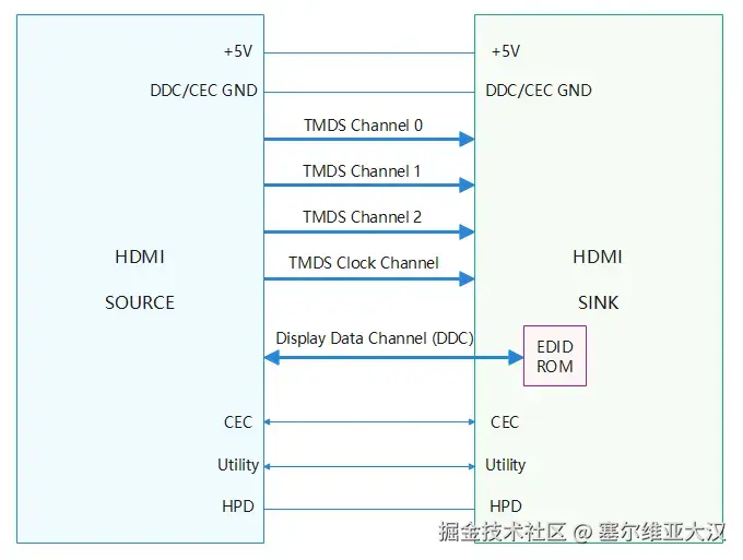 HDMI以主从方式工作,通常有一个Source端和一个Sink端。