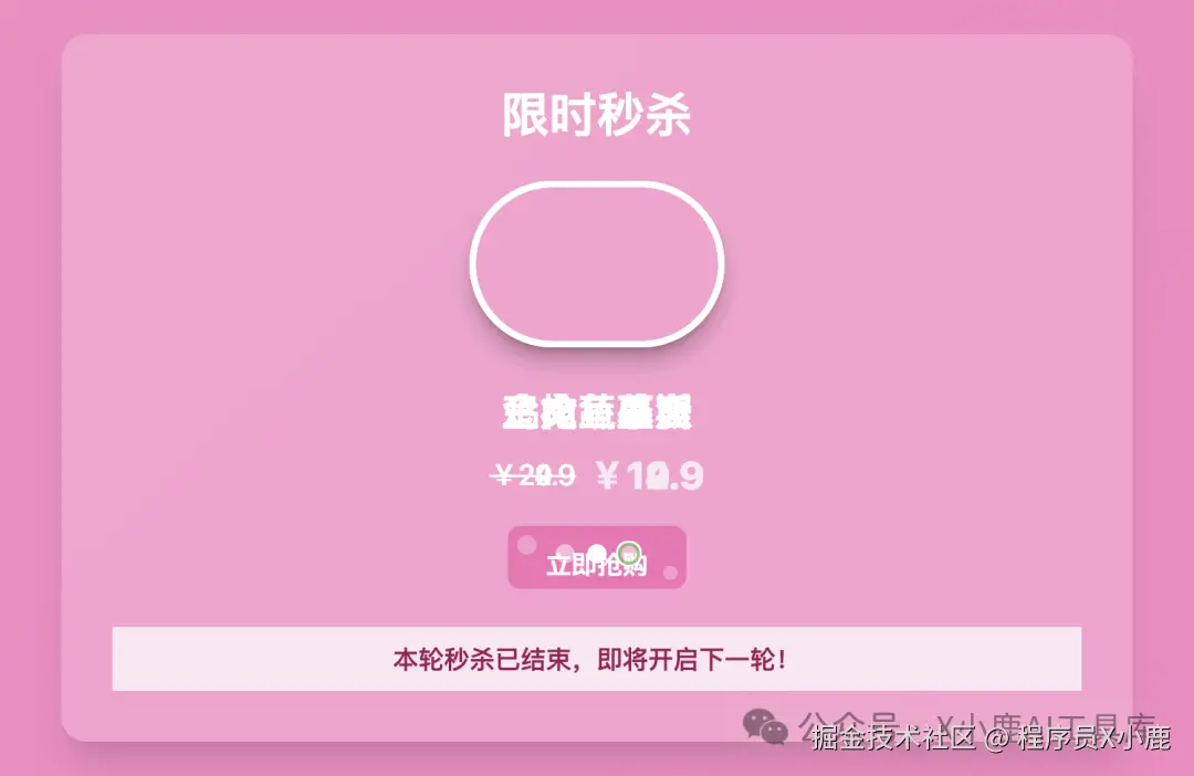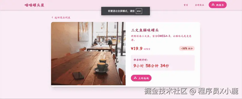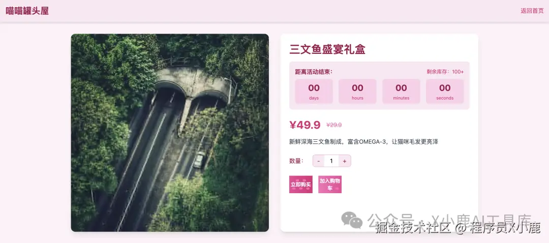 提示词:创建一个卖猫罐头的粉色网站,把按钮做成猫爪子的形状,首页有“爆品秒杀”轮播图,点进商品详情页,有秒杀倒计时