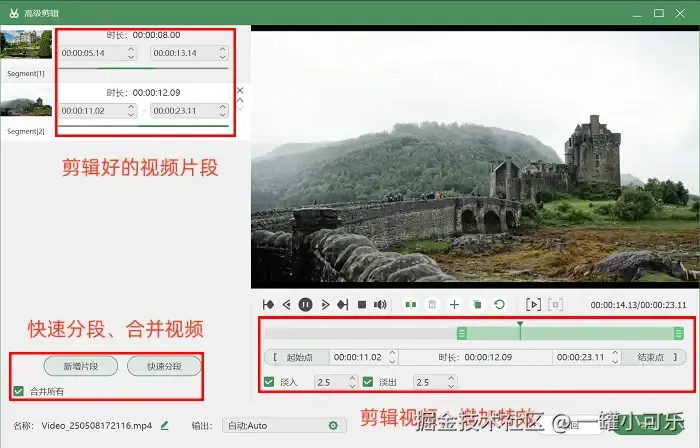 步骤3:全部录制结束后,我们就可以点击 “高级剪辑” 进入后期编辑页面了。在这里可以快速分段视频、剪辑需要的视频片段等。