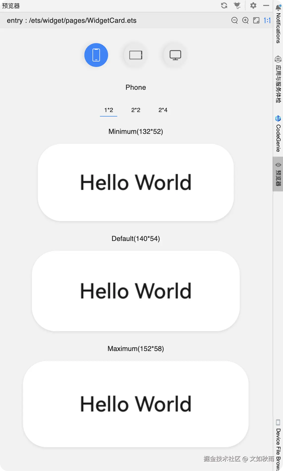 打开 widget 目录下的WidgetCard.ets 文件,该文件是服务卡片的初始页面文件。打开预览器,开发者可以看到,服务卡片提供3种场景的预览效果,分别为极窄(Minimum)、默认(Default)、极宽(Maximum),如图 4-14 所示:
