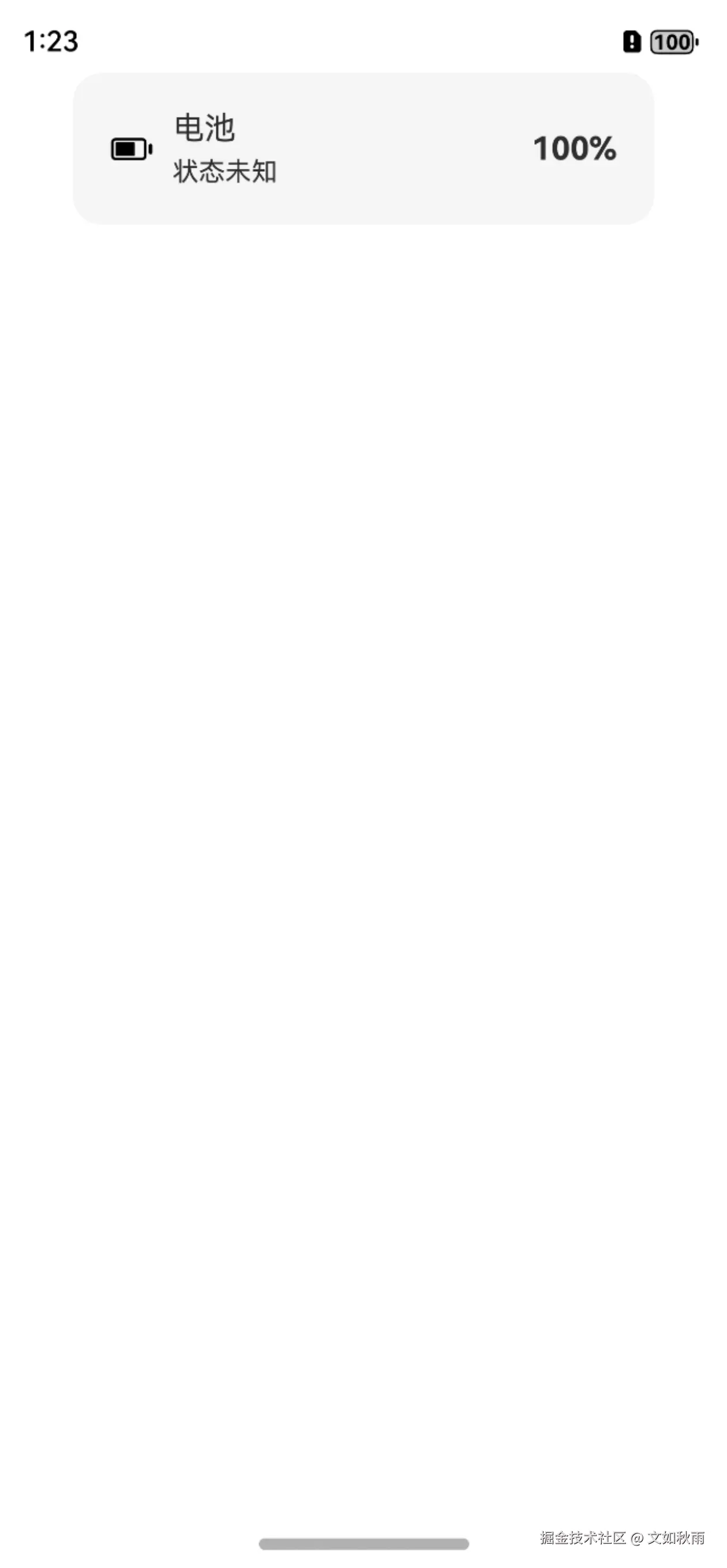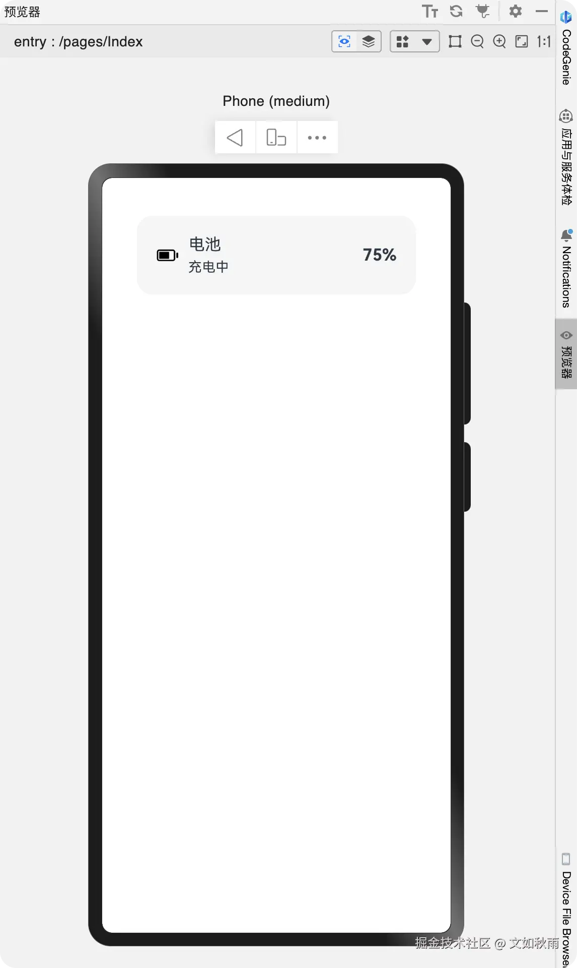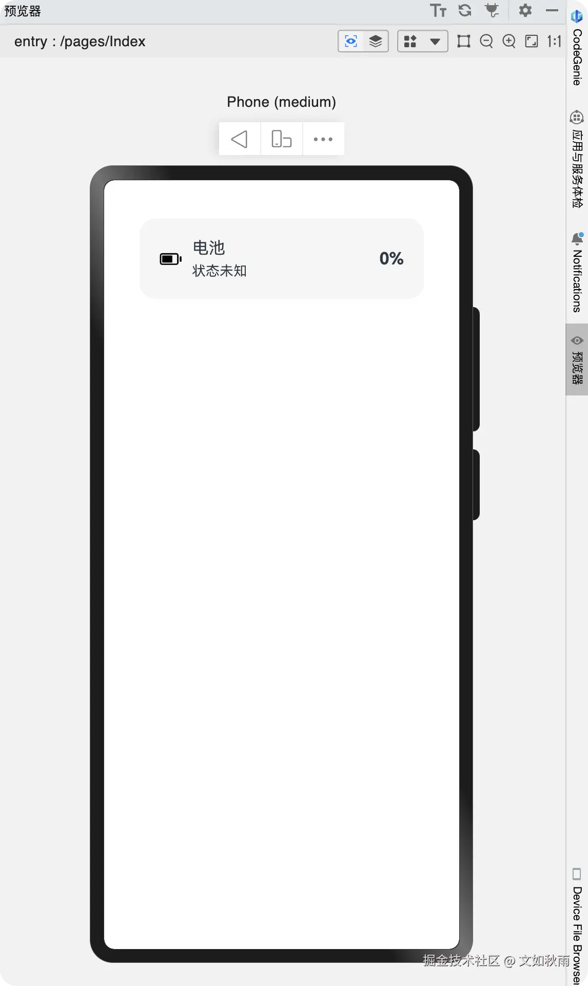 此时在预览器中,由于预览器无法调用batteryInfo 接口获得真实的电量信息,因此电量与充电状态文字分别 0 和未知。如图 4-15 所示。