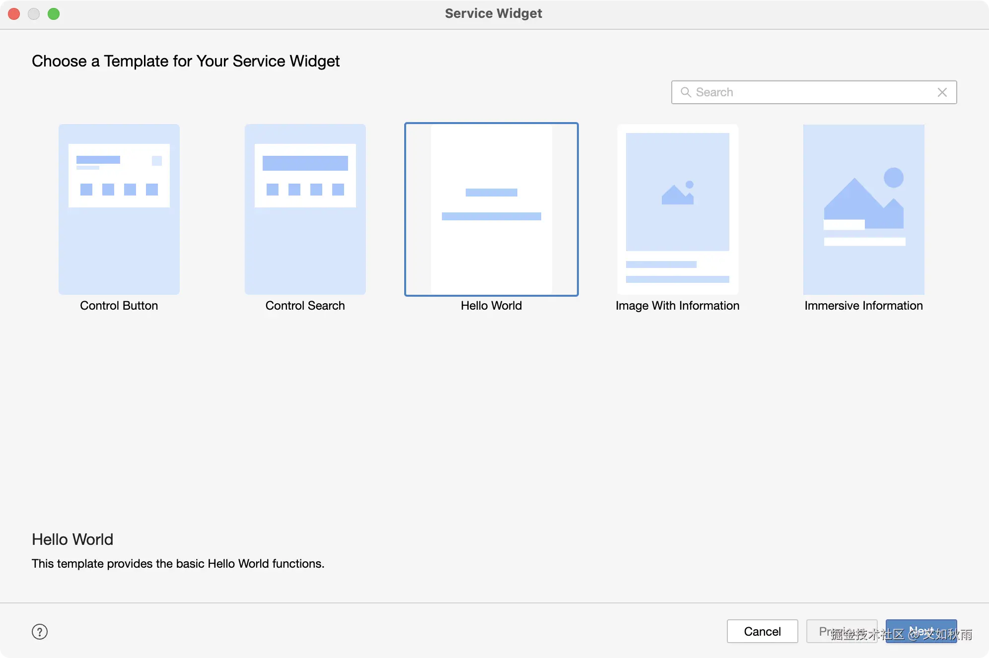 点击鼠标左键选中src 目录,点击鼠标右键右键以此选择“新建” > Service Widget > Static Widget,在“模版选择”弹窗中选中 Hello World 模版,如图 4-12 所示。