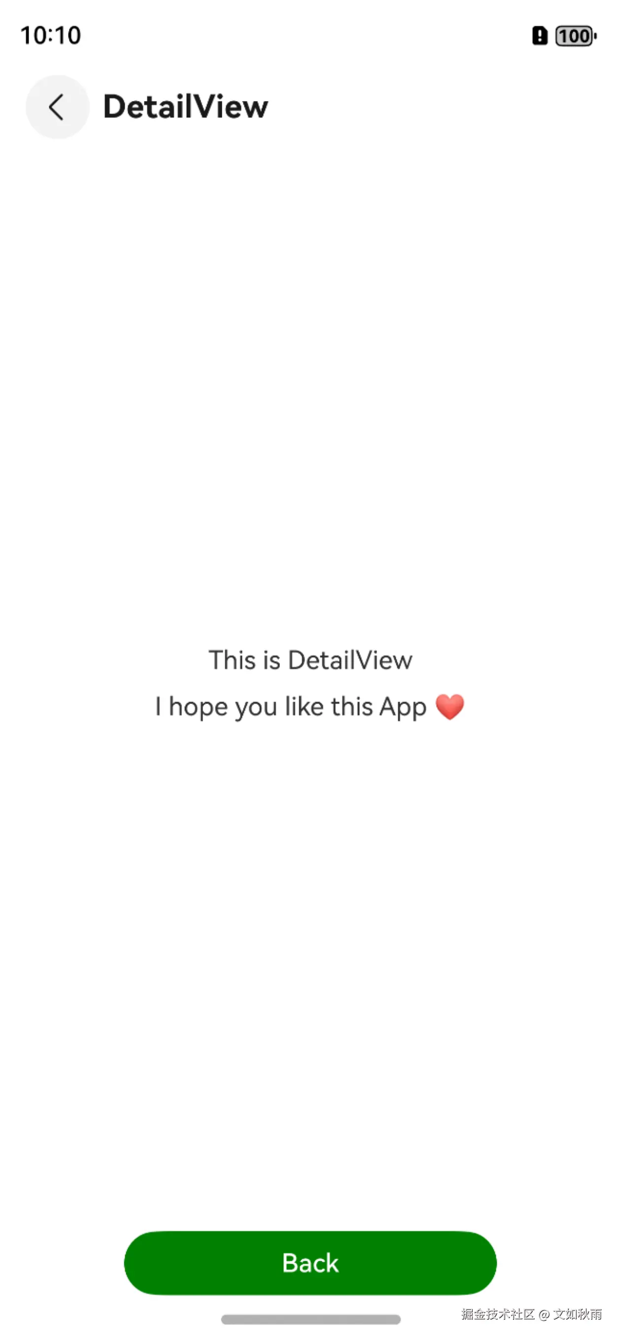 在预览器中,开发者可以预览页面跳转到目标页面的交互和传参效果,并可通过点击DetailView导航的“返回”按钮或底部的 back 按钮回到IndexView页面,如图 4-11 所示。