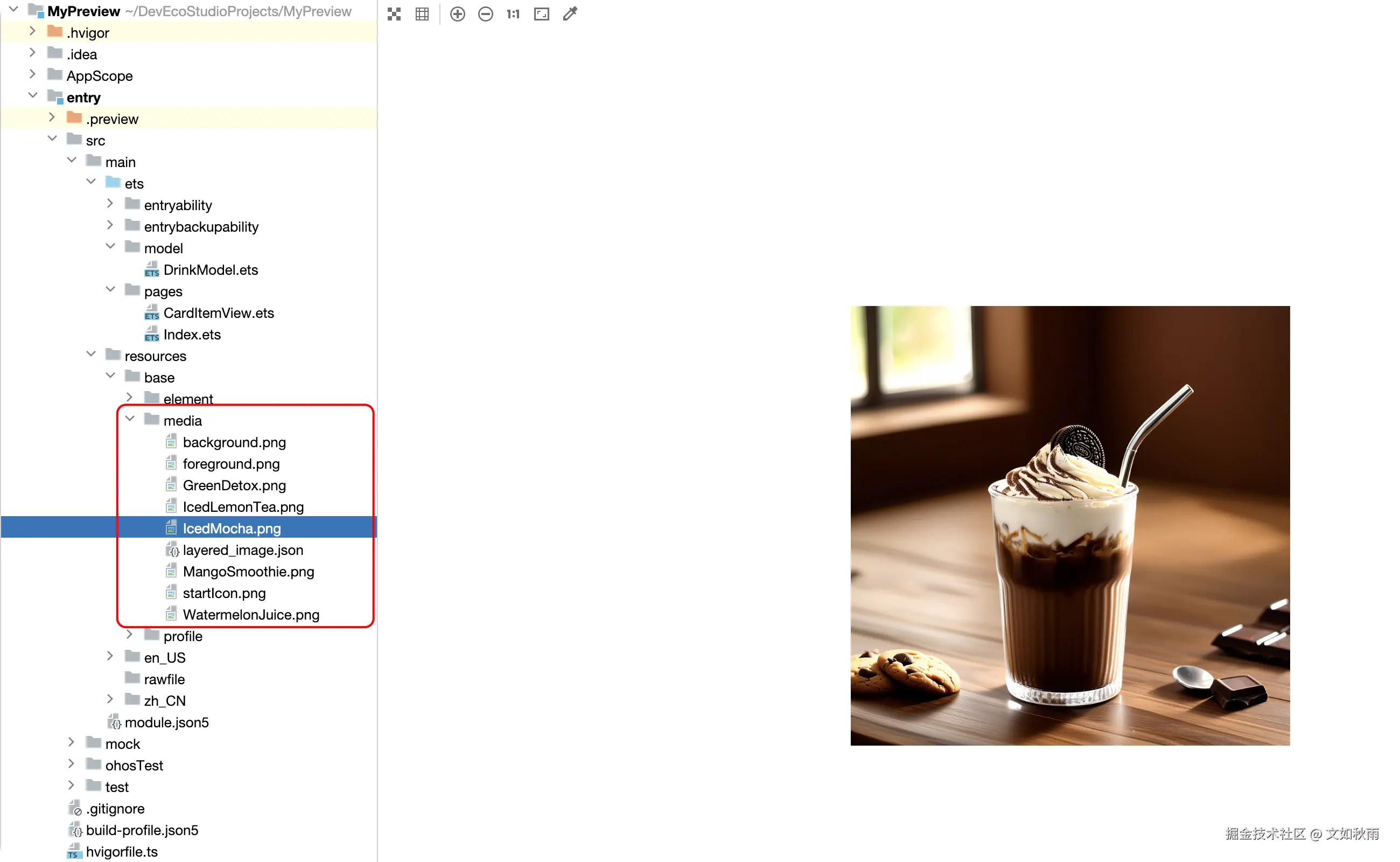 将下载好的图片素材拖放media文件夹中,路径为entry/src/main/resources/base/media。如图 4-2 所示。