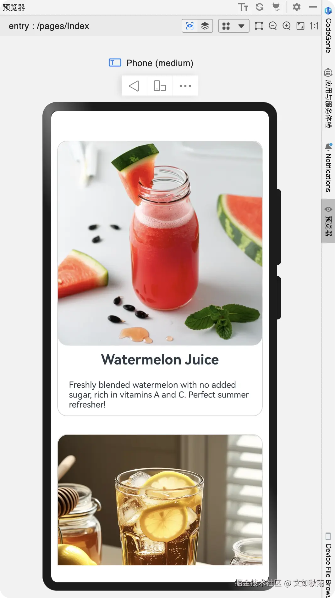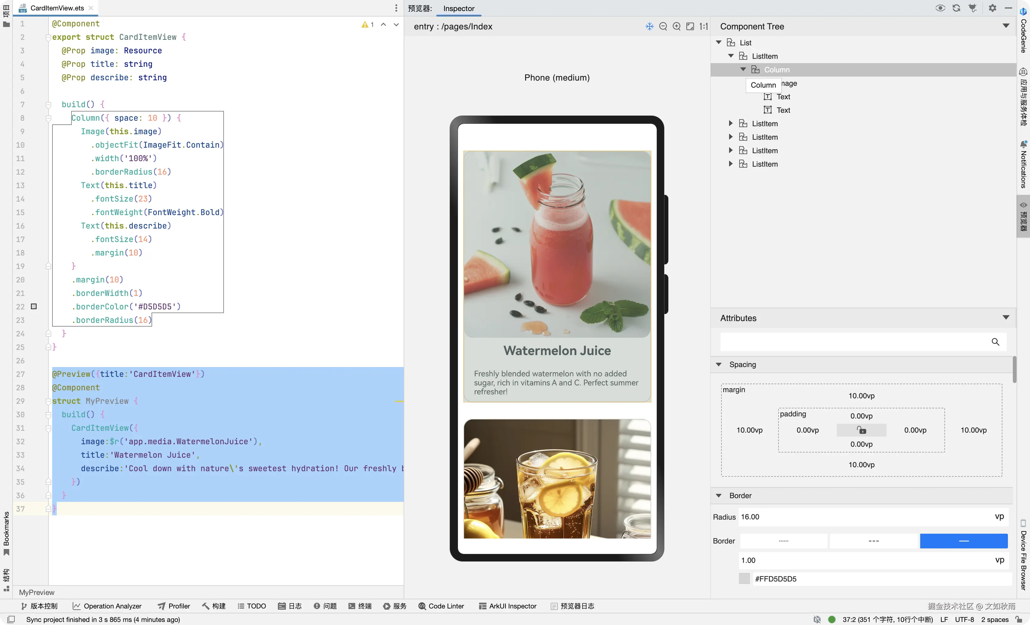 回到 Index 视图中,由于drinkData 和DrinkModel归属于model目录,CardItemView组件归属于CardItemView.ets文件,因此在使用时需要使用import 关键字在 Index.ets 文件中引入相关文件,代码如下: