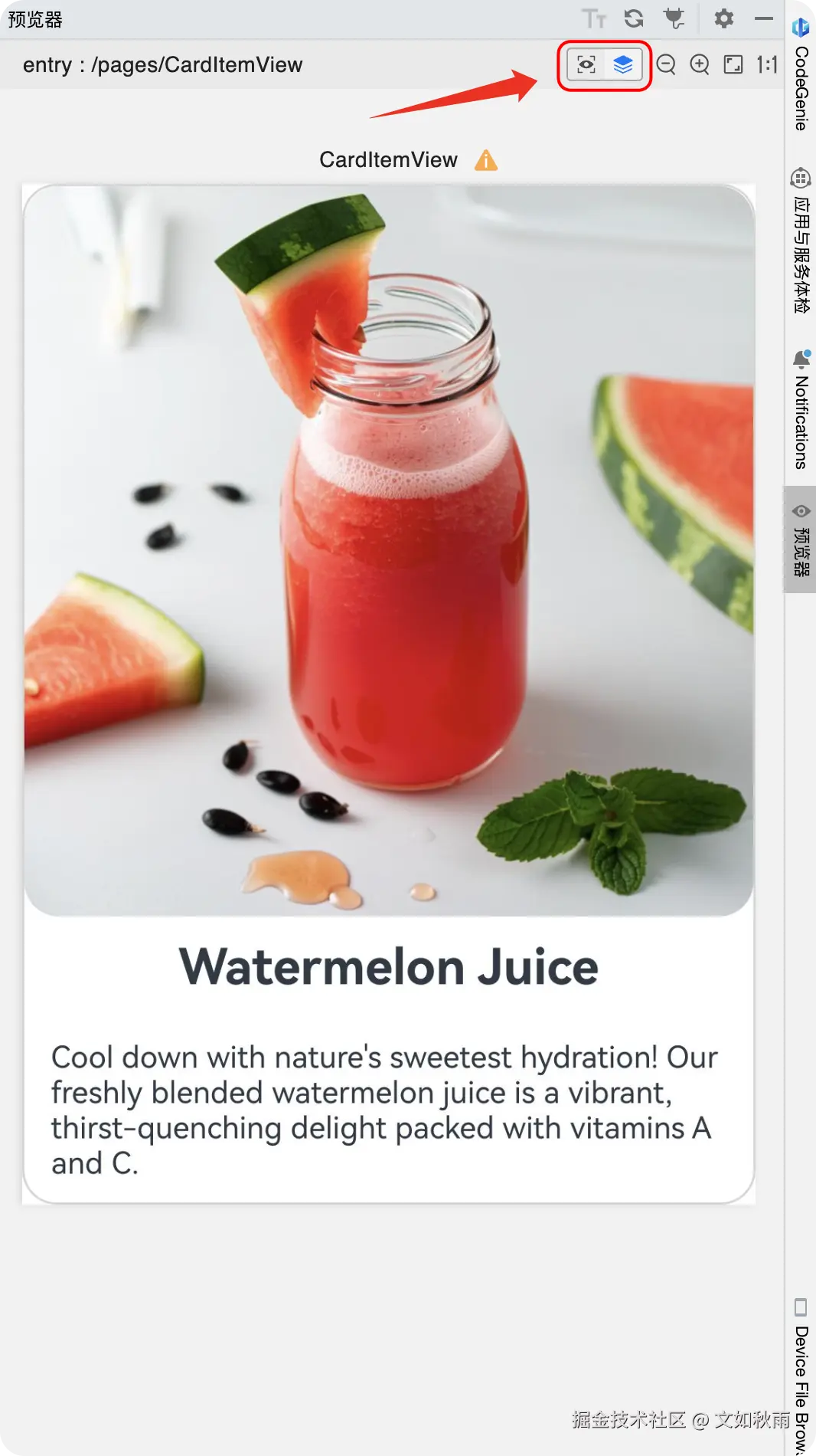 使用注释装饰器@Preview 构建一个预览视图MyPreview,将CardItemView 组件作为预览组件放置在MyPreview组件的build()函数中,并为CardItemView 组件的参数赋予初始值,代码如下: