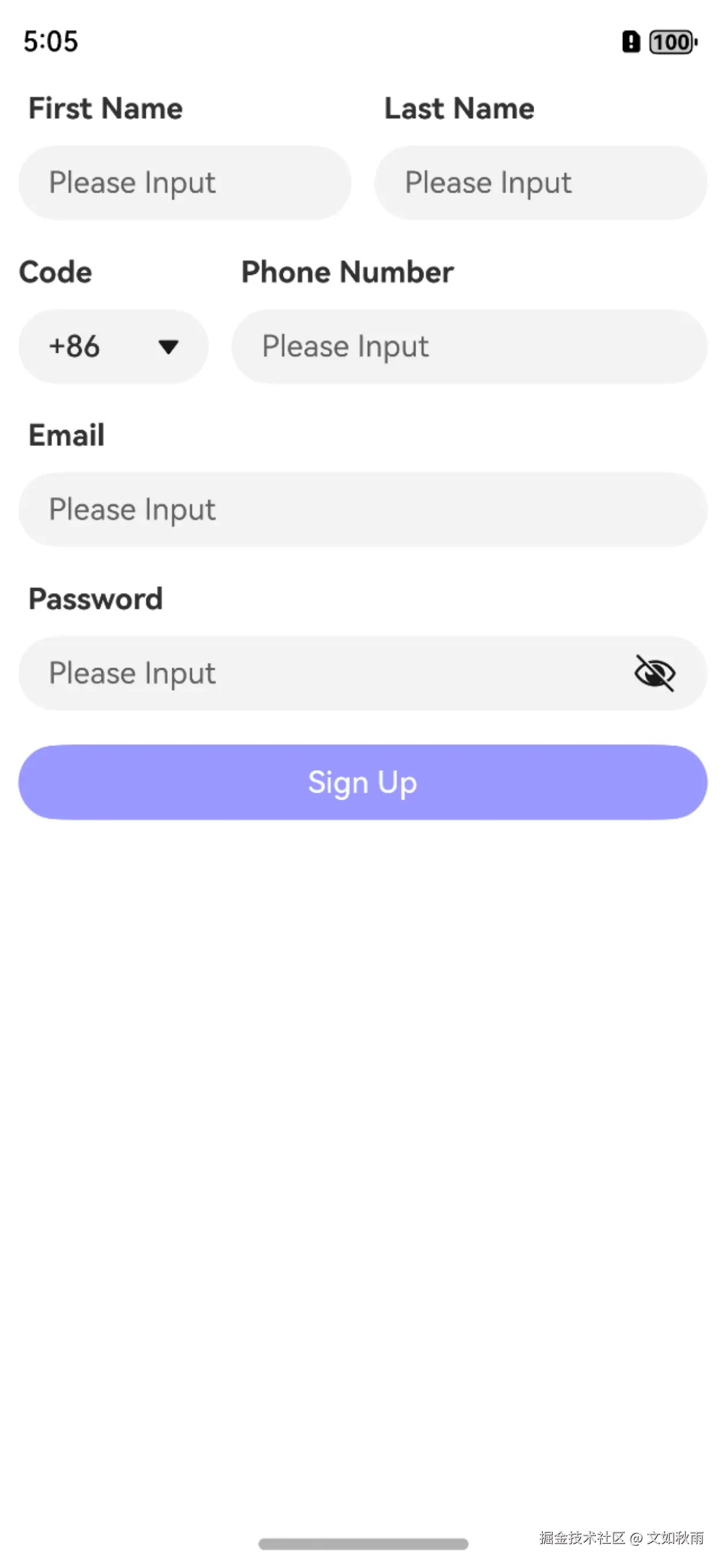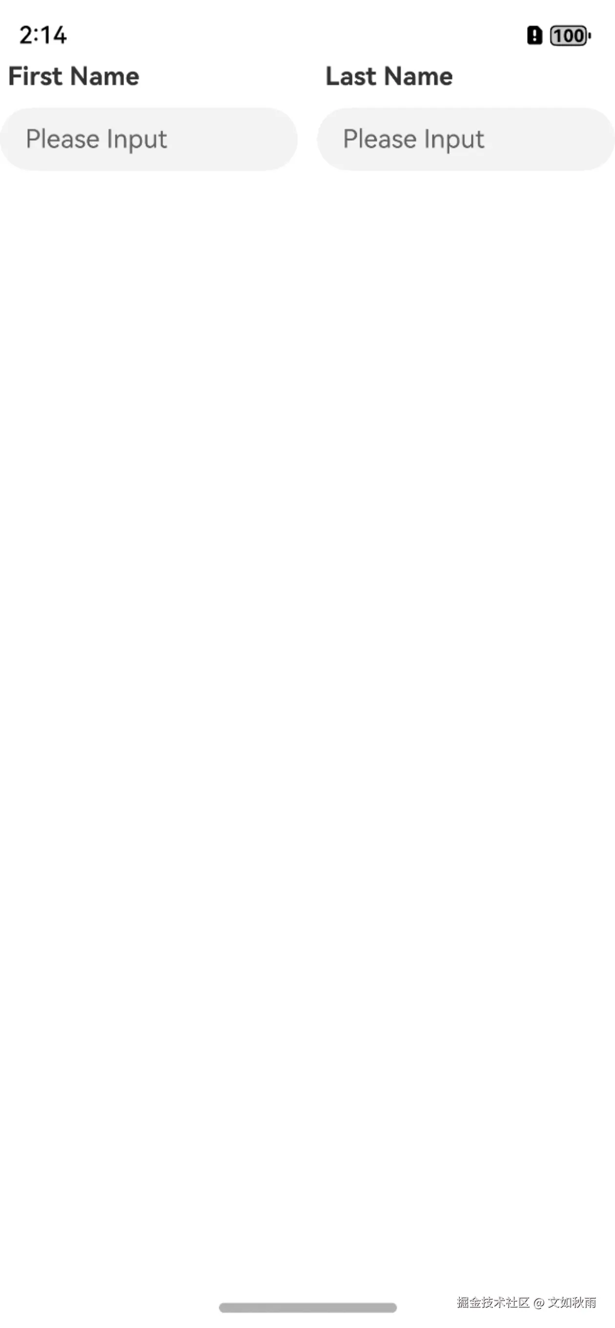 使用CustomTextInputView 子组件作为Flex组件的子组件,CustomTextInputView组件分别绑定了firstName和lastName,同时设置不同标题、占位符和输入类型等参数值,用于显示不同的 UI。