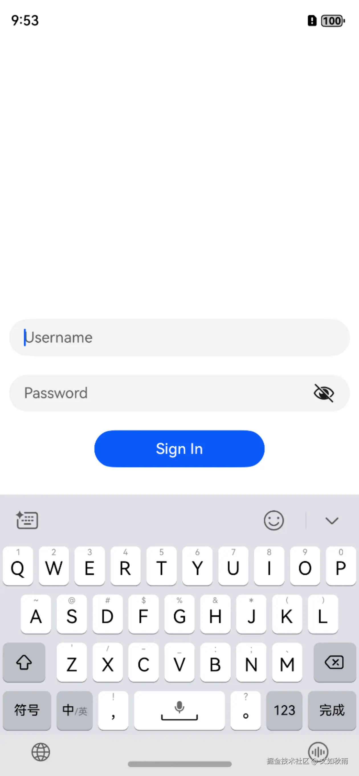 在模拟器中开发者可以观察到,页面加载时,用户名输入框会自动获得焦点并弹出软键盘。在用户名输入框中输入内容后,按下“完成”按钮,焦点会切换到密码输入框,且软键盘保持弹出状态。如图 5-5 所示。