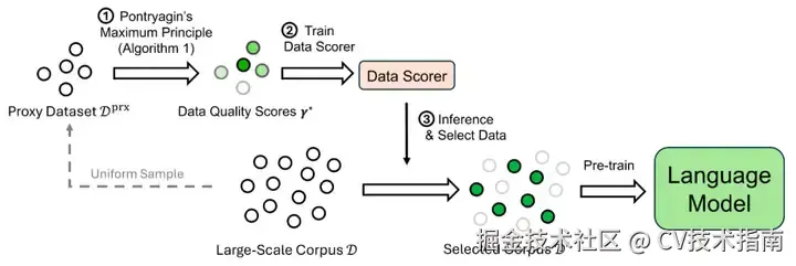 - 训练数据打分器(data scorer):用一个小模型在代理数据集上拟合 γ*,根据输入样本输出其质量分数,然后为全量数据集打分;