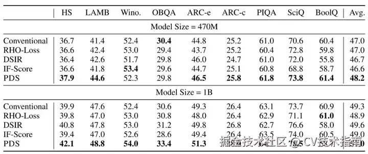 在不同模型规模下,PDS 训练出的模型在 9 个下游任务上的整体性能优于随机选择(Conventional)、RHO-Loss、DSIR、影响函数(IF-Score)等方法,并且性能提升趋势随着模型规模的扩大依然可以保持:
