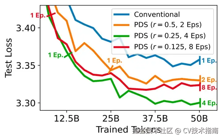 作者们通过实验证明,在数据受限场景下,使用 PDS 选择一部分高质量数据并进行多轮训练,要好于使用原始数据进行一轮训练。如下图,图中蓝线表示使用原始数据进行 1 轮训练,而橙色线、绿色线、红色线分别表示使用 PDS 选择原始数据的 50%,25% 和 12.5%,并进行 2 轮,4 轮和 8 轮的训练,从而保证总体训练 token 数一致。可以看到,使用 PDS 选择质量较高的 25% 数据表现最好,由此说明 PDS 提升了数据有限情况下模型的性能,即提升了数据利用率,缓解了 “数据枯竭” 问题。