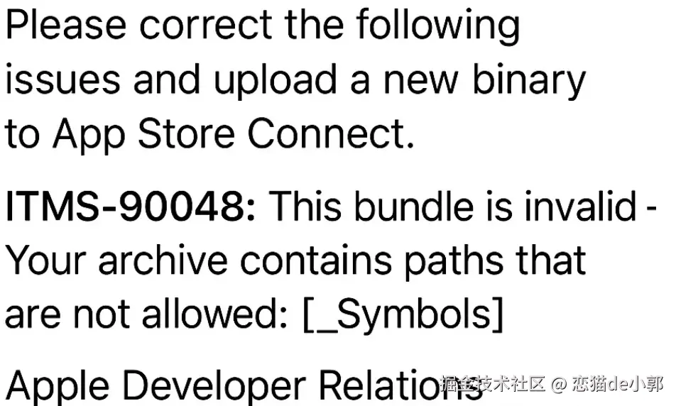 这个错误的核心原因是在提交给 App Store Connect 的归档文件 (.xcarchive) 里,包含了一个不允许存在的隐藏文件 ._Symbols 。