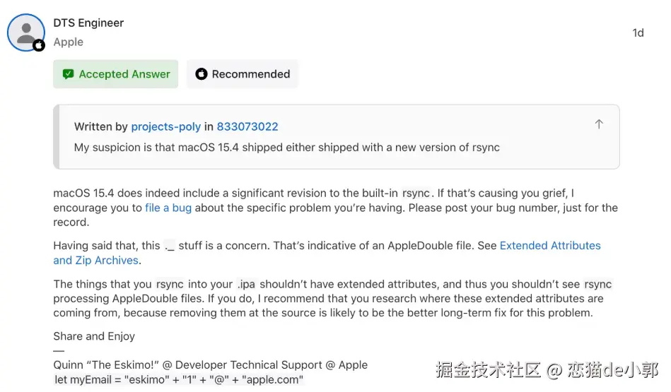 然后同样是之前聊过的 《「ITMS-90048」This bundle is invalid 》 的 #166367,不上用户在升级到 macOS 15.4 后发现,通过命令行打包的 ipa 在提交后会出现 ITMS-90048 被拒绝问题: