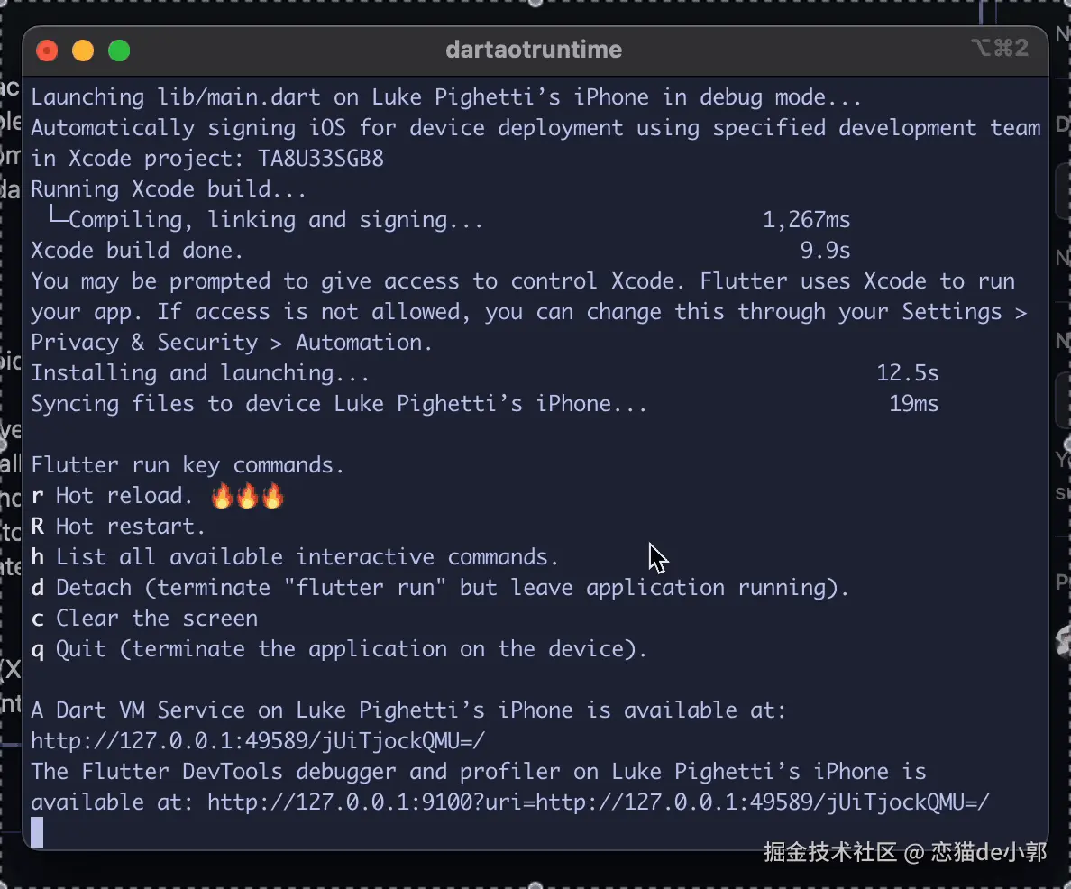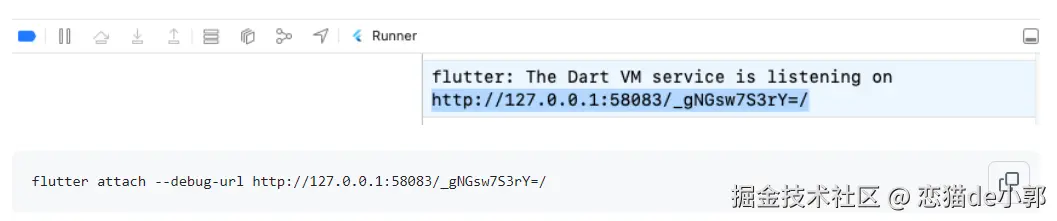 如果需要在 iOS 模拟器上使用 flutter attach,可以从 Xcode 复制 Dart VM Service 的 url ,然后在命令行进行传递 flutter attach --debug-url :