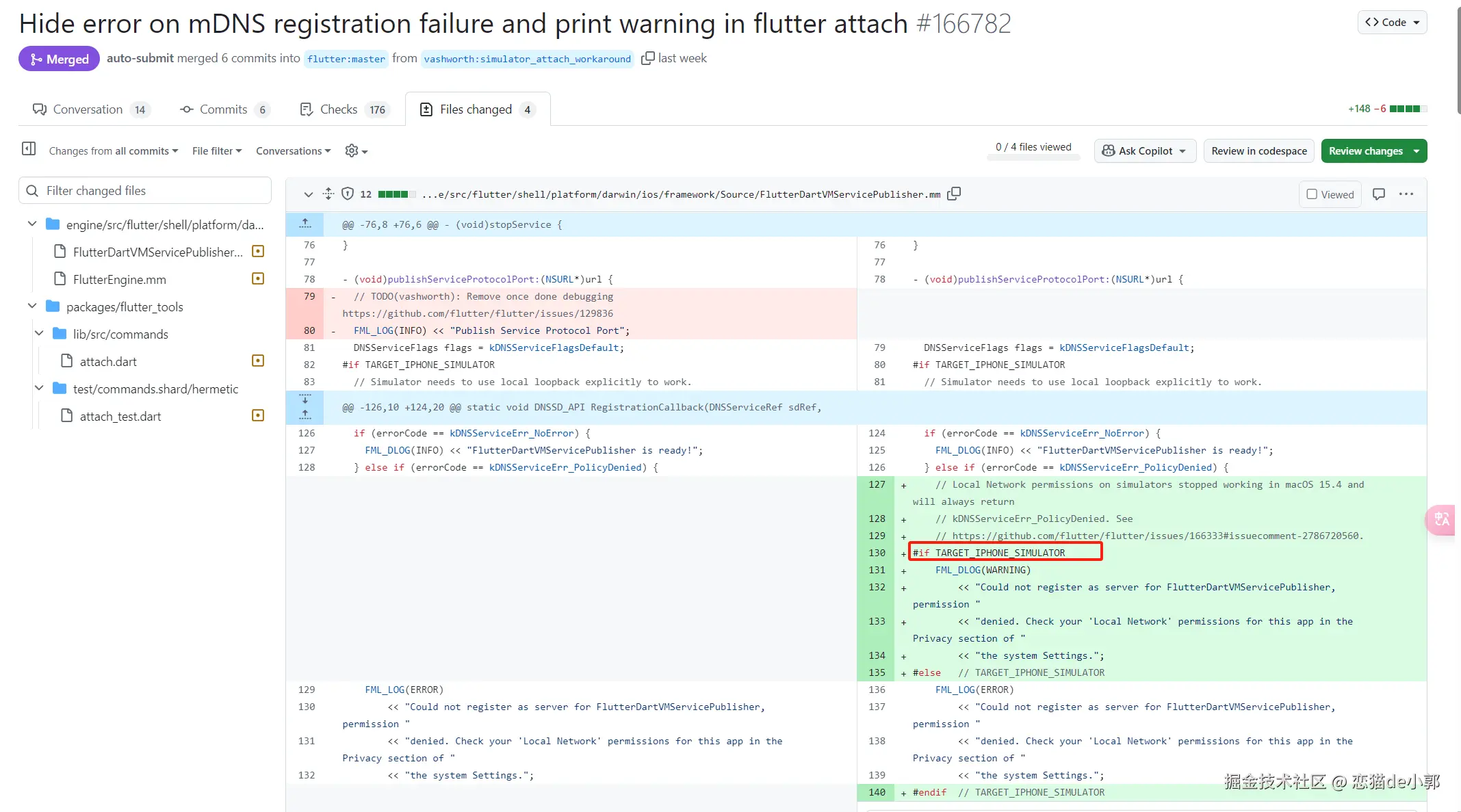 接下来的问题是 #166333 的 「Could not register as server for FlutterDartVMServicePublisher」 ,问题还是和 macOS 15.4 和 Xcode 关联,主要影响的是 macOS 15.4 上的模拟器,会让 iOS 模拟器上的 flutter attach 不起作用。
