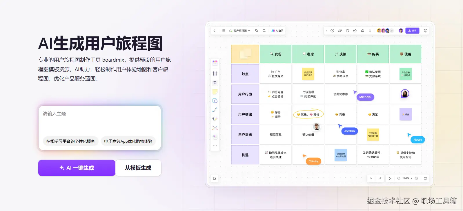 日常有线上协作或跨团队沟通的朋友,可优先考虑使用这里介绍的用户旅程图生成器boardmix,畅享AI创作和协同办公双重提效带来的全新体验!