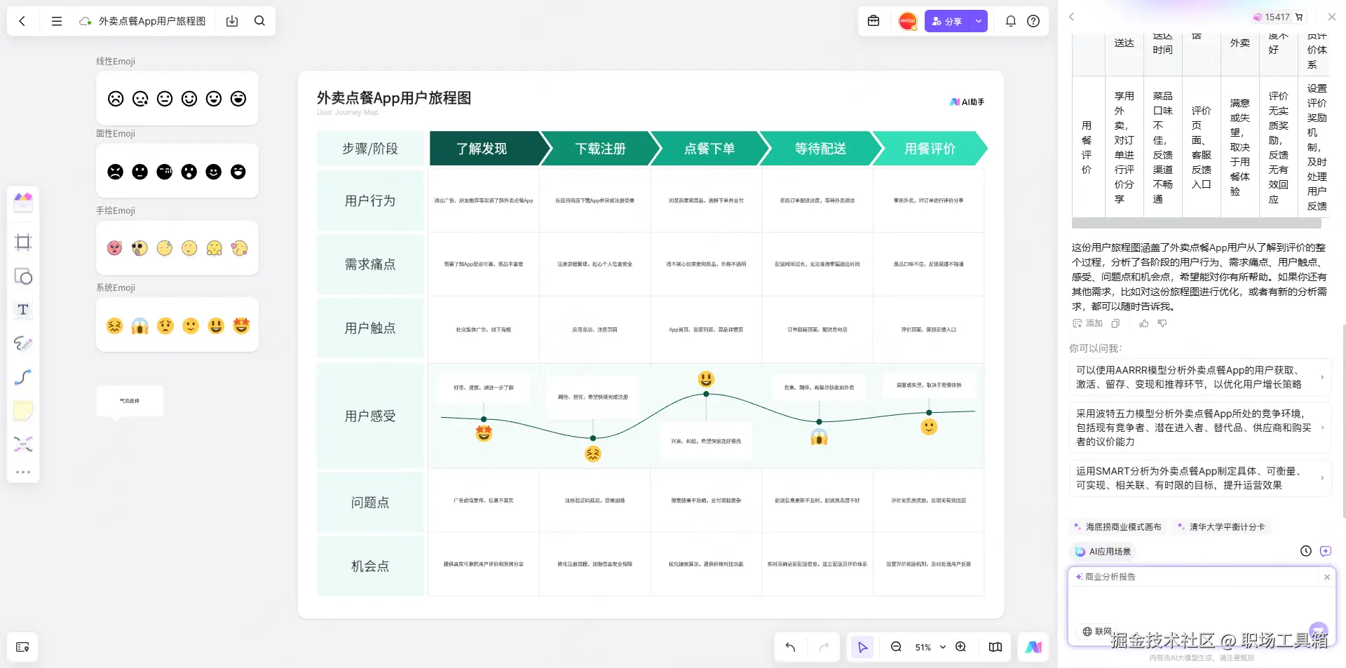 值得一提的是,boardmix AI具备追问和多轮对话能力,生成用户旅程图后,AI会在下方推荐相关的建议,方便我们在现有用户旅程图的基础上,作进一步的深入分析,持续优化产品用户体验。