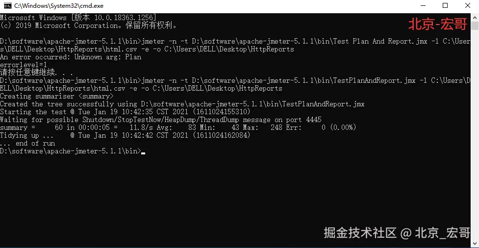 1.在输入命令运行的时候,宏哥遇到了找不到测试计划(An error occurred: Unknown arg: Plan),宏哥第一感觉就是测试计划的名字中间有空格(其他可能情况:特殊字符、路径错误、中文等等吧)去掉后就可以运行了。