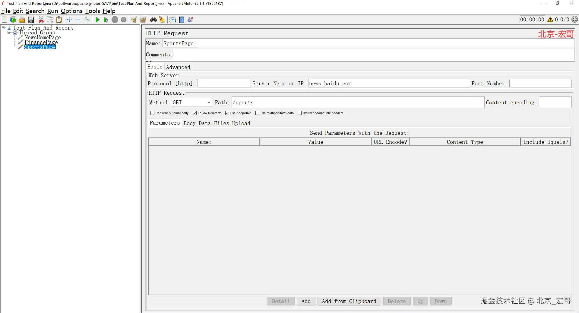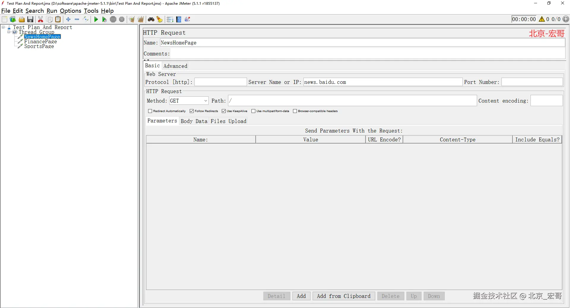 - 新建三个Http Request,分别是百度新闻首页,和百度新闻财经,百度新闻体育,如下图所示: