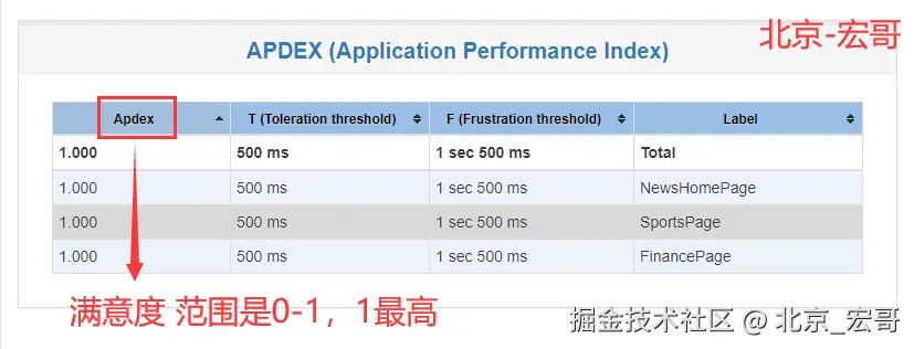 APDEX(Application Performance Index):应用程序性能满意度的标准,范围在 0-1之间,1表示达到所有用户均满意,可以在配置文件设置。关于APDEX的相关信息,请参考这里:应用性能指标;英文原文,参考这里:Apdex-Wikipedia