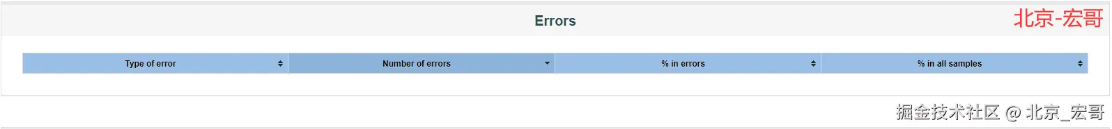 错误表提供了所有错误及其在总请求中所占比例的摘要。Errors: 错误情况,依据不同的错误类型,将所有错误结果展示。