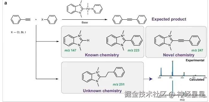 MEDUSA Search 注册了广为人知的 H-NHC 和 Ph-NHC 离子,以及在 Pd/NHC 催化下 Sonogashira 反应混合物中新发现的 [NHC-乙炔基]⁺ 离子。基于同位素分布搜索过程可以检测出以前未知的乙基-NHC 产品