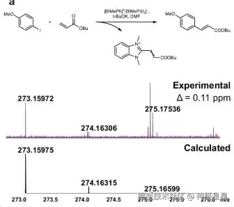 在 Pd/NHC 复合物 [BIMePh]⁺ [BIMePdI₃]⁻ 催化下,对对甲氧基碘苯与丙烯酸丁酯之间的 Mizoroki–Heck 反应混合物进行质谱分析,发现形成了 [BIMe (CH)₂COOBu]⁺。 用超高分辨率质谱法确认了分子式。涉及 [IPrCHC(Ph)COOBu]⁺ 形成的实验是用于区分均相和非均相催化的汞。通过排除汞对反应物种的干扰,并保持其他条件与原始实验相同。分子式也通过超高分辨率质谱确认,化学结构通过 MS/MS 实验验证。