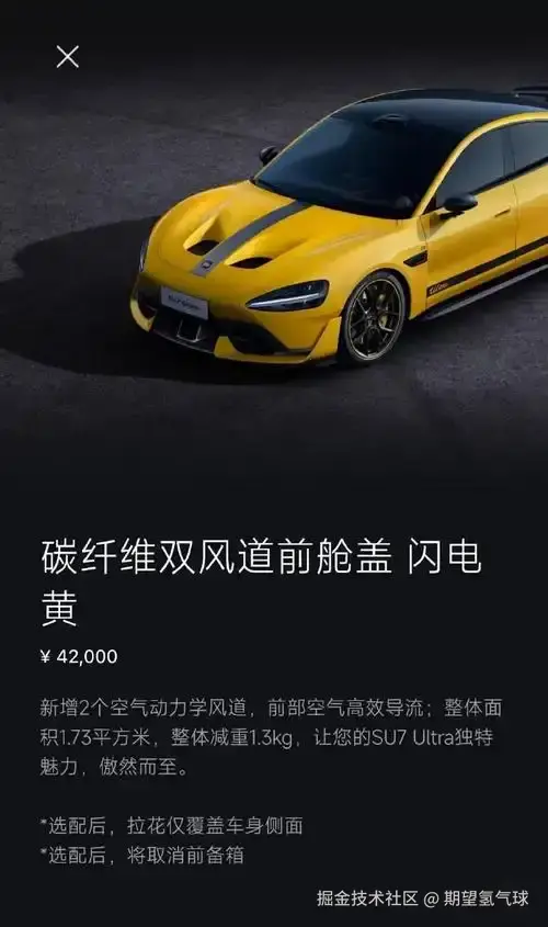 一提到这事,评论区就变成了战场。"退车的都是黄牛""车主根本没意见,都是友商黑"。当然现在小米确实在被饱和式攻击,但是真正犯错的时候,怎么还嘴硬呢?还有人说4.2万的碳纤维机盖已经很良心了,国外同类产品起码10万。但问题从来不是价格贵不贵,而是你明明知道它只是个装饰件,为什么要用那么容易让人误解的方式描述它?