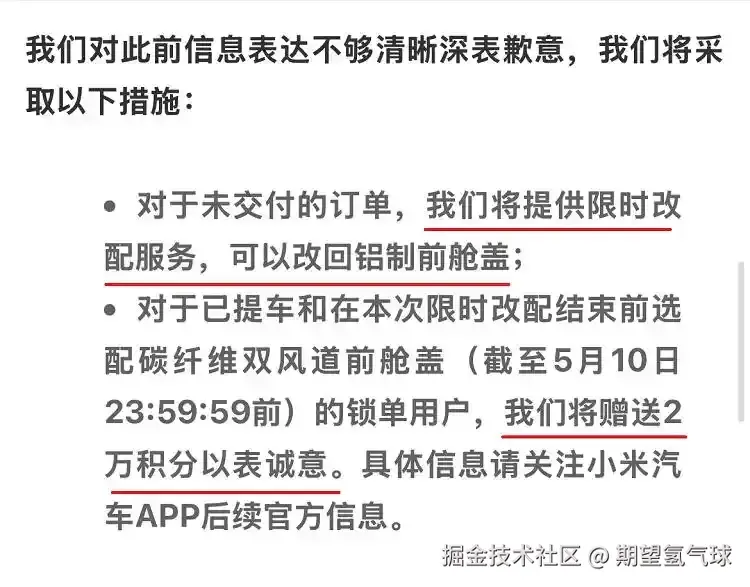 面对车主们的质疑,小米给出了什么补偿方案呢?给已提车和坚持要挖孔机盖的车主发2000元积分。而如果你选择改配不要挖孔了,不仅没有积分补偿,还得重新排队等车!方案,怎么说呢...就像你在餐厅点了份牛排,结果上来的是牛肉饼,老板说:要么你就吃这个,我送你瓶可乐;要么你重新排队等真牛排。