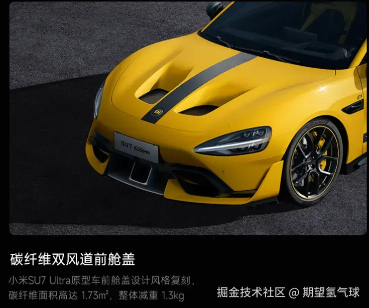 SU7Ultra有个选配的碳纤维机盖,特点是有两个圆形挖孔,售价4.2万元。在原型车上作为真正的空气动力学套件对性能有至关重要的作用。