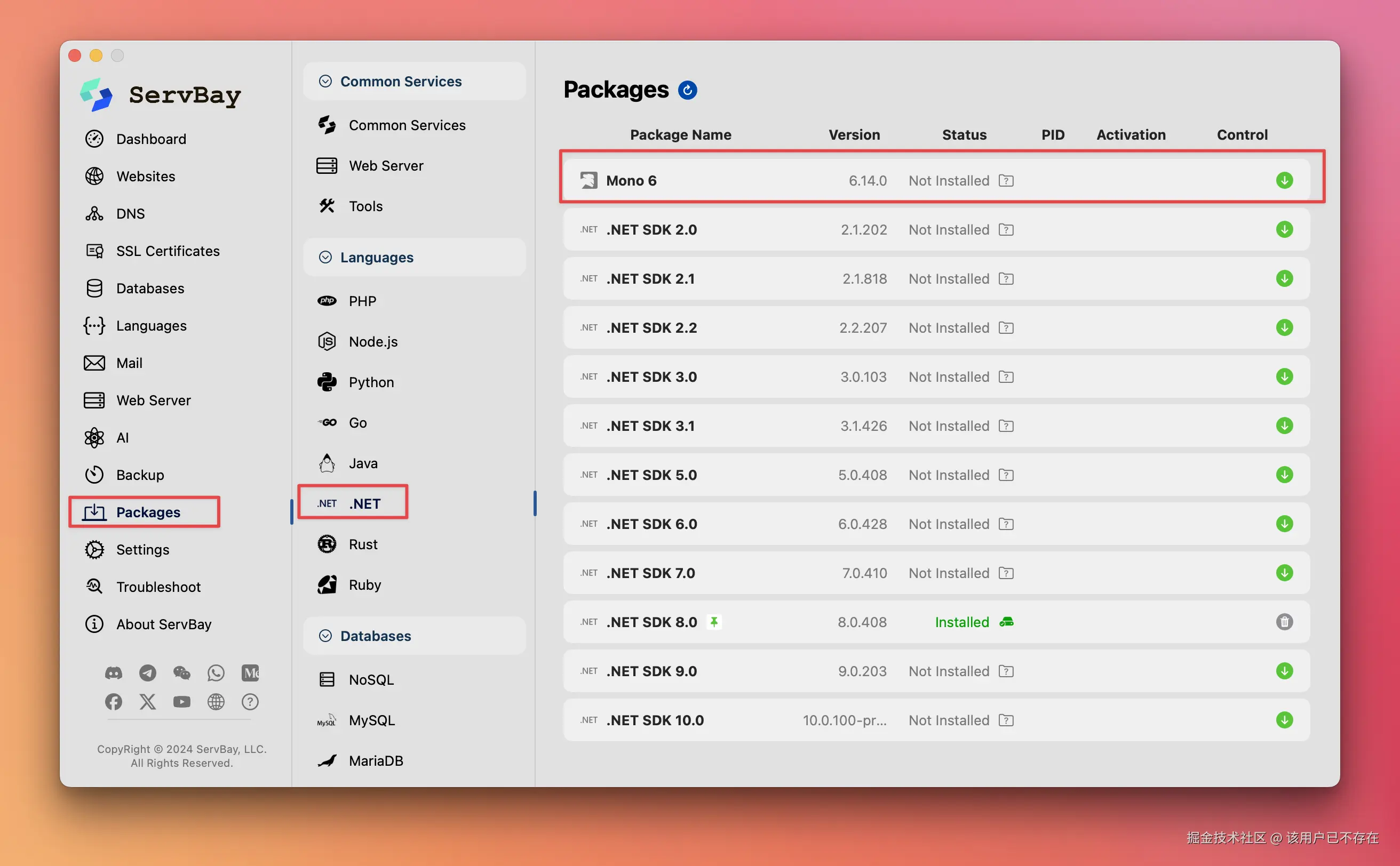 - 通过 ServBay 的「软件包」安装 Mono 6 和 Nginx。