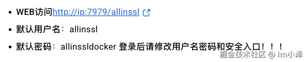 docker run -d --name allinssl -p 7979:8888 -v /www/allinssl/data:/www/allinssl/data allinssl/allinssl:latest