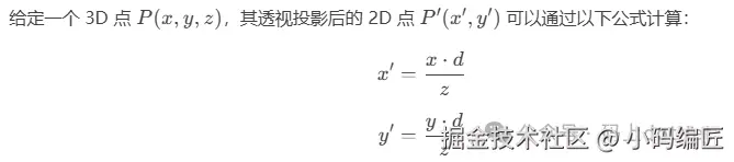 透视投影的核心是通过一个投影矩阵将3D坐标转换为2D坐标。其基本公式涉及视点到投影平面的距离(d)和点(P)的深度(z)。通过调整这两个参数,可以精确控制投影的效果,实现物体大小随距离变化的视觉效果,增强图像的真实感和立体感。