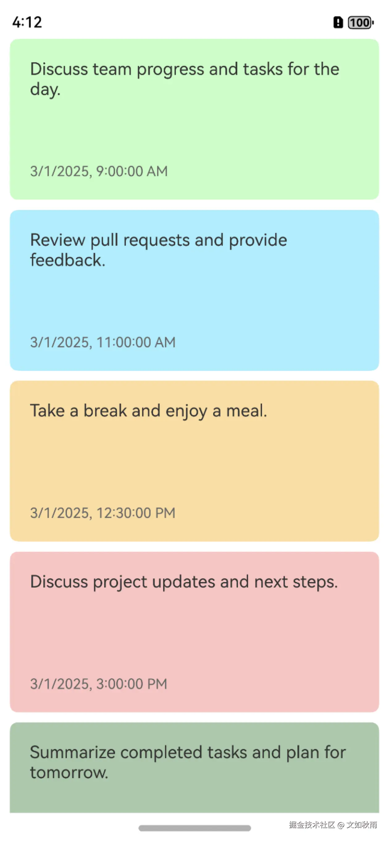 noteItem 参数类型为NoteModel,表示传入的参数可以从NoteModel 接口中获取。在build()函数中构建 UI 时,Text 组件可以NoteModel 接口中获取其属性的数据来显示内容。由于Text 组件只能接收 string 类型的数据,因此在显示noteItem.createdAt 的值时,需要使用toLocaleString()方法对日期进行本地时间的格式化处理。