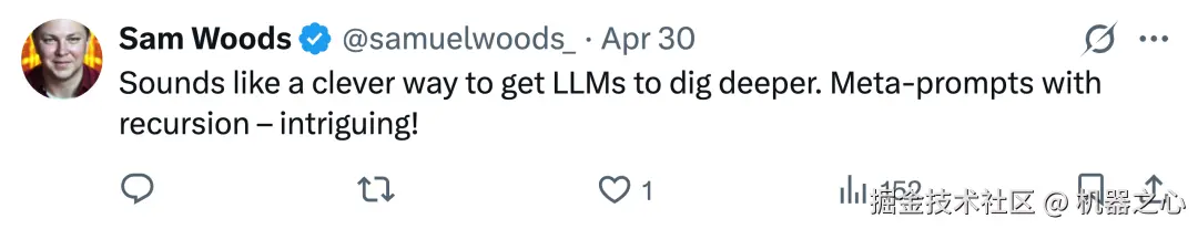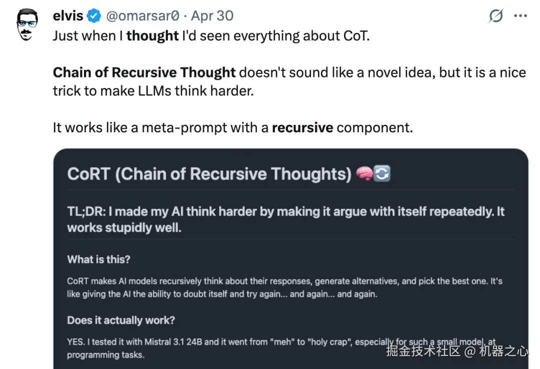 然而,很多网友对 CoRT 的出现并没有感到太激动。CoRT 是让 LLM 更努力思考的不错技巧,但称不上什么新颖的 idea。它的工作原理就像一个加入了递归组件的元提示(meta-prompt)。