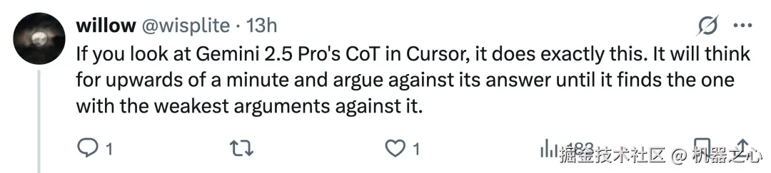 比如在 Cursor 中配置的 Gemini 2.5 Pro,它的 CoT 就是这样做的。模型会思考一分钟,并反驳自己的答案,直到找到最无力反驳的答案。