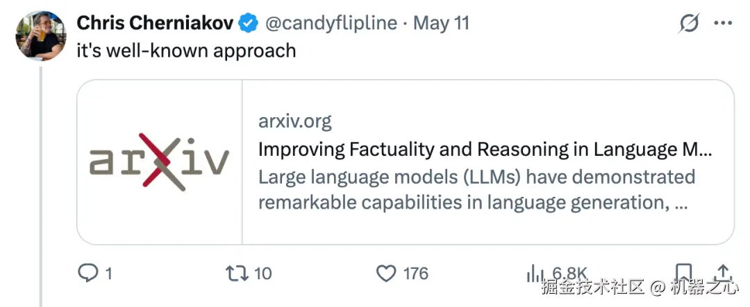 还有网友指出,这种方法在 2023 年的论文中《Improving Factuality and Reasoning in Language Models through Multiagent Debate》就出现了。