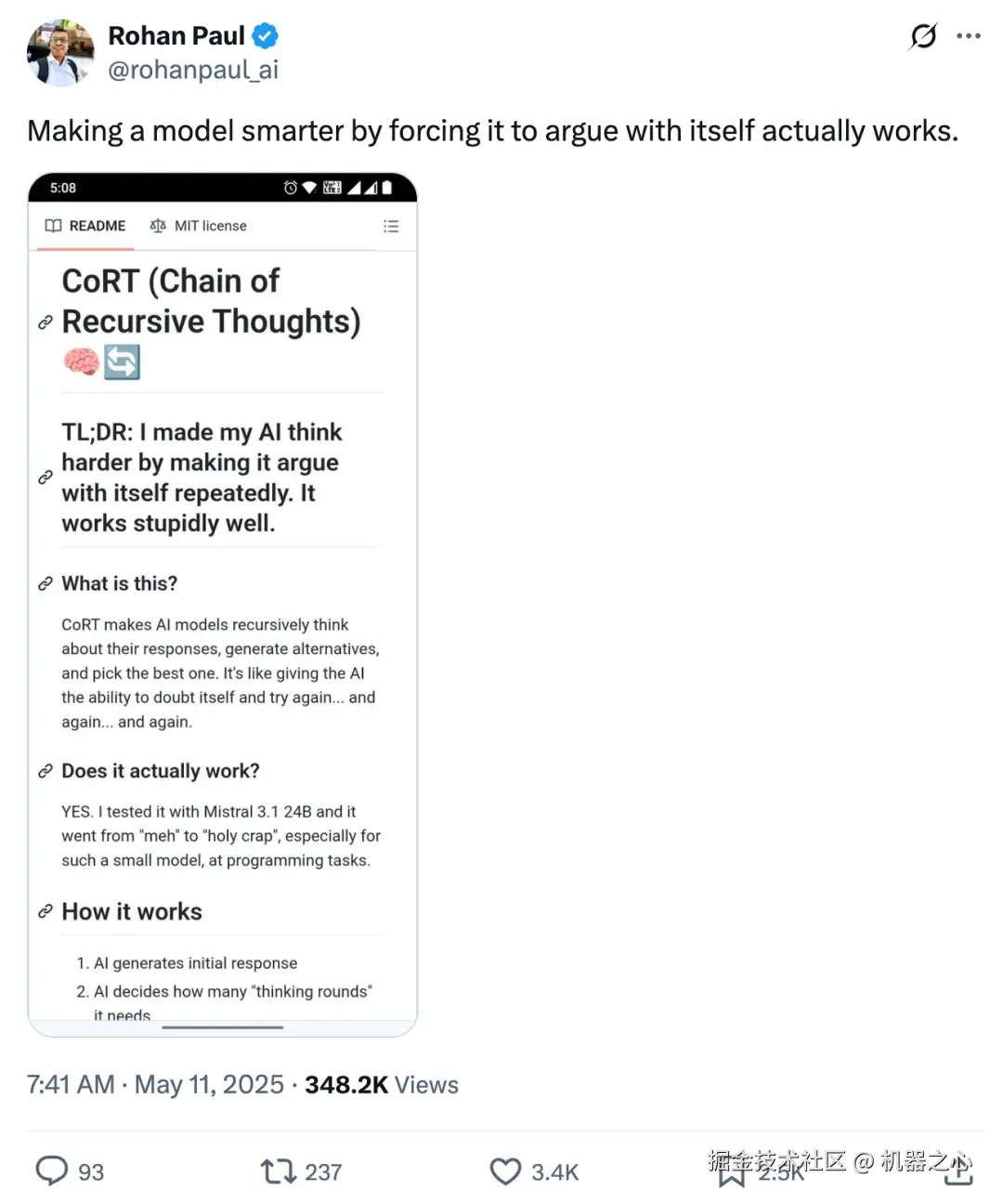 这几天,一个名为 CoRT(Chain-of-Recursive-Thoughts)的概念火了!从名称上来看,它在 CoT 中加入了「递归思考」这一步骤。