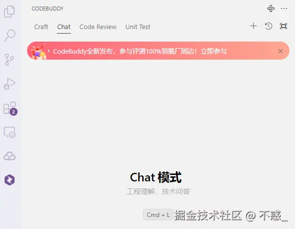 安装完成之后,CodeBuddy 会自动在侧边栏生成一个入口,点进去可以看到几个标签页:Craft、Chat、Code Review、Unit Test……该说不说,这 UI 做得确实挺有范儿,科技感满满。