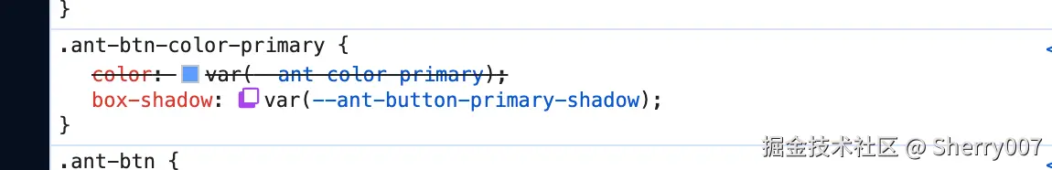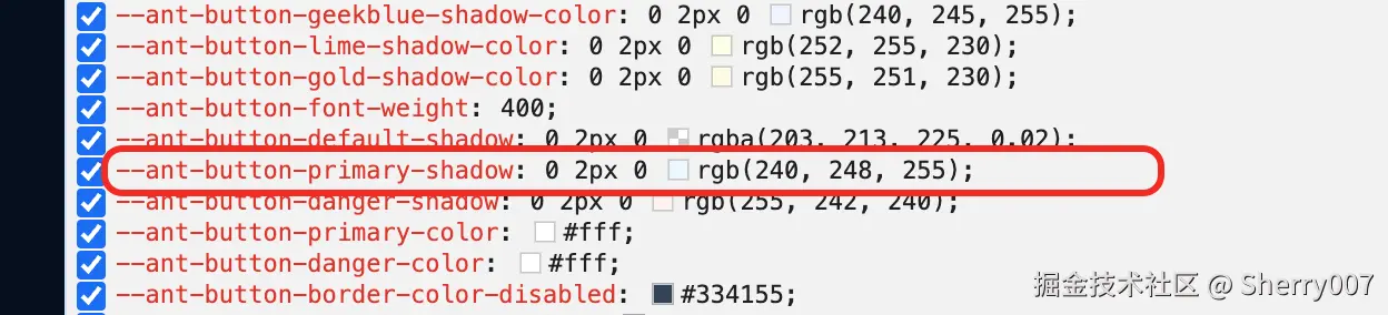 --ant-button-primary-shadow 变量的值来实现我们的目的,但是我们需要有两个值,他们分别是在 light 模式和 dark 模式下,那在 css 中怎么判断当前是出于 light 还是 dark 模式呢,这个我暂时还没有好的办法;所以还有一种办法就是找到他的 Design Token,我们直接在前文提到的 antdThemeConfig.ts 中修改,那么怎么寻找呢?
